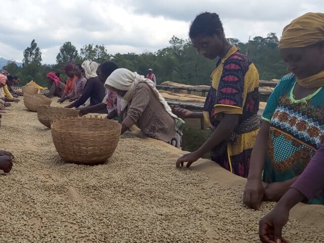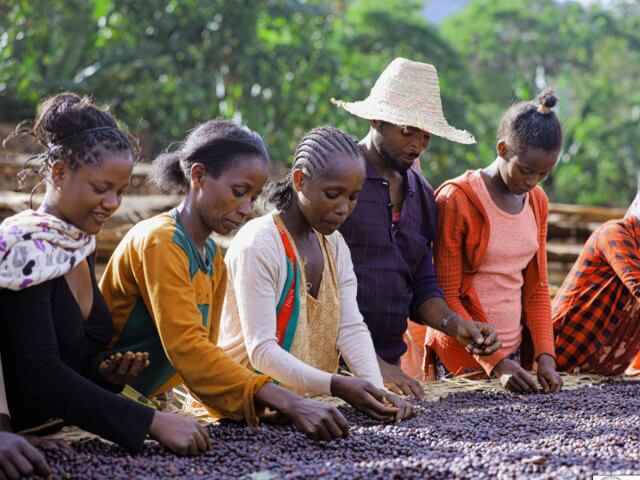 ウォルカ農協の収穫期は10月後半から1月にかけて行われます。ウォッシングステーションでは、エチオピアで一般的な工程でナチュラルプロセスが行われています。収穫したチェリーはウォッシングステーションに運び込まれると再選別され、密度の低いチェリーや枝葉などが取り除かれます。均一な熟度のチェリーに選別されると、乾燥場へ運ばれます。チェリーは高床式のベッドに移動すると、およそ3週間かけて理想的な水分値になるまで天日で乾燥をさせます。乾燥中は、乾燥ムラのないように攪拌され、また損傷したドライパーチメントなどを丁寧に取り除いています。